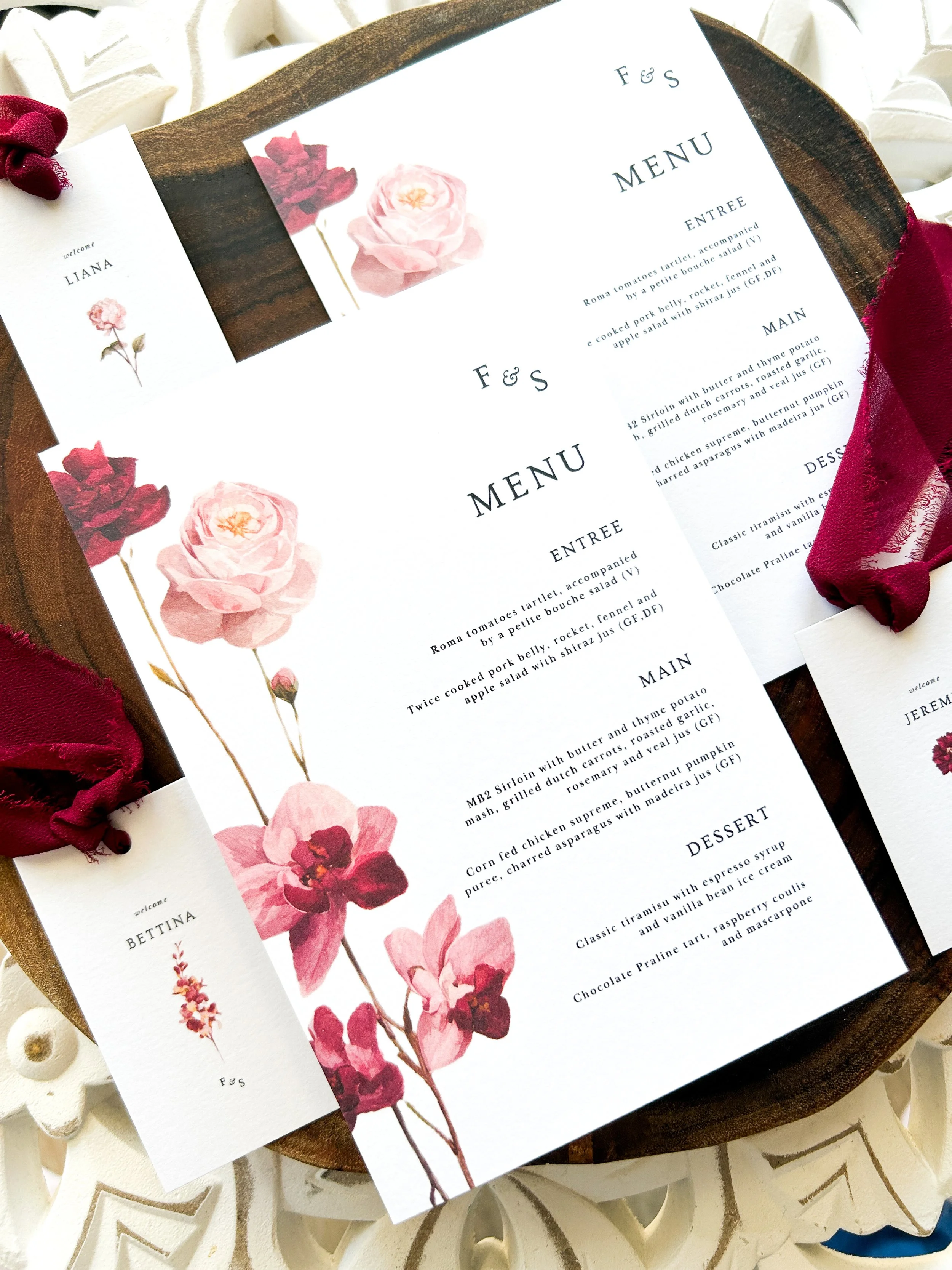 If you're planning a wedding that’s full of colour, these menus are your moment. With deep painterly florals framing each guest’s name in bold serif type, they feel equal parts refined and full of romance.