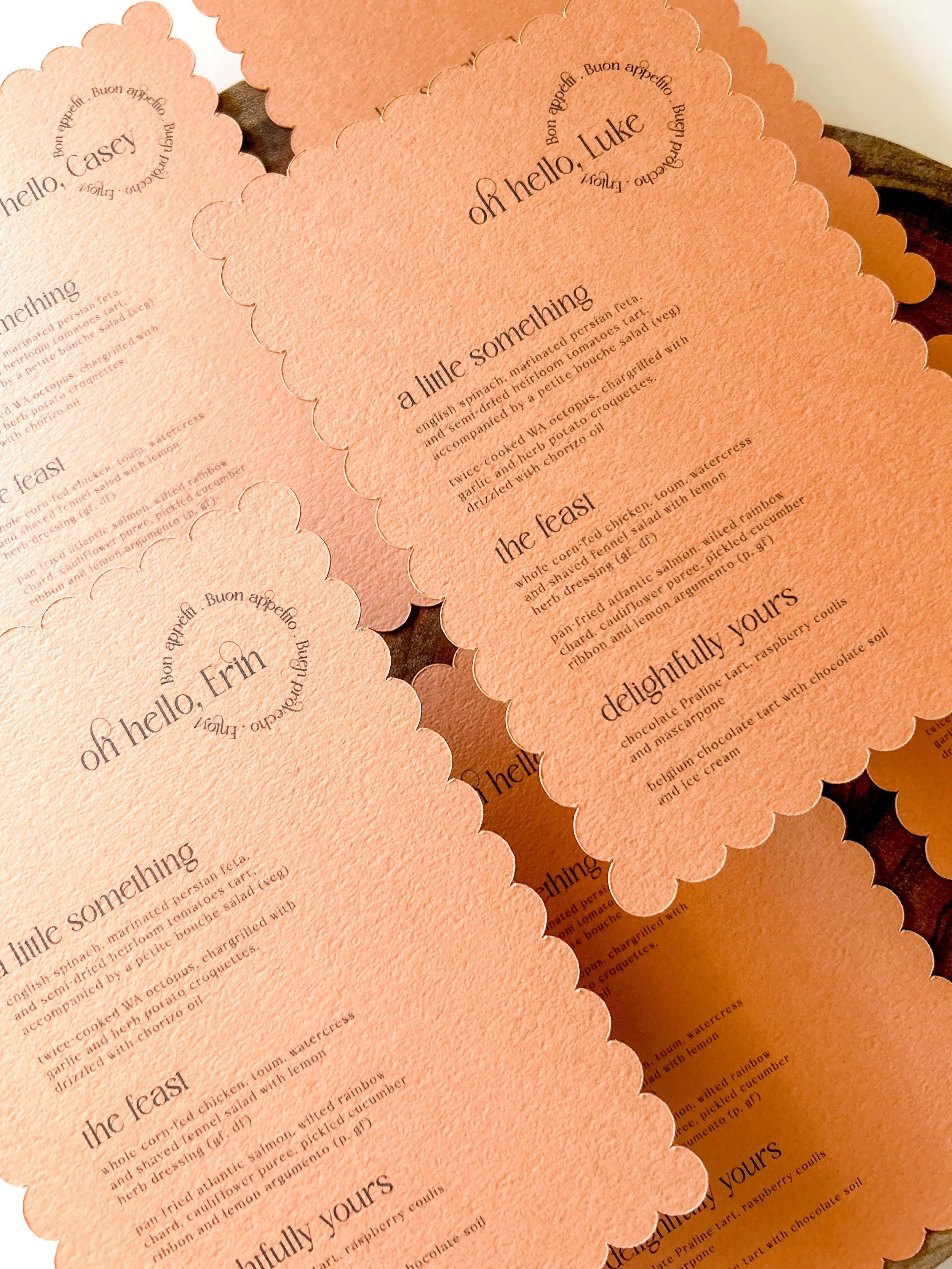 These playful, retro-inspired designs are full of personality! Each guest’s name is tucked into a curved heading, wrapping around sweet greetings like “oh hello” or “bon appétit.” The scalloped edges add a feminine, slightly nostalgic feel that works beautifully with soft linens and candlelight.